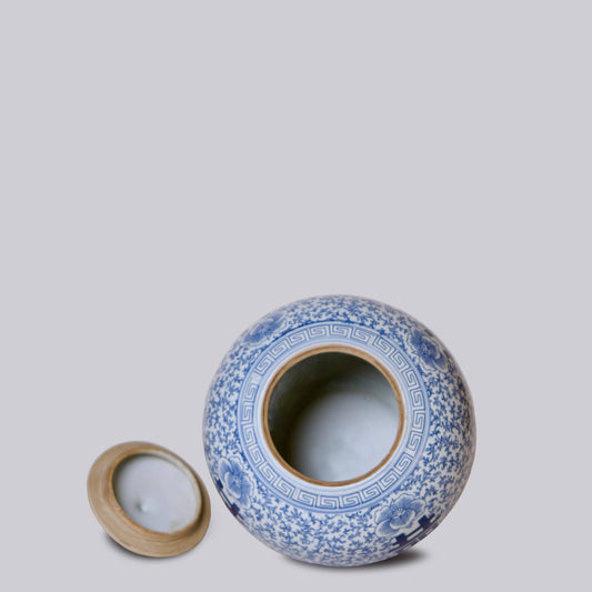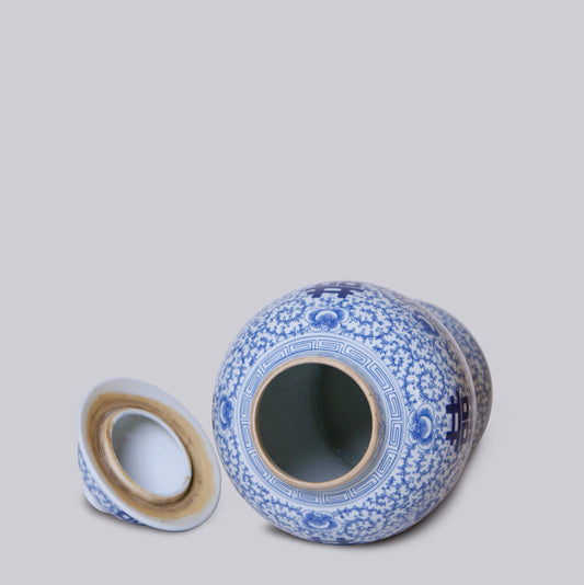 Double Happiness/Scrolling Peony Blue and White Temple Jar