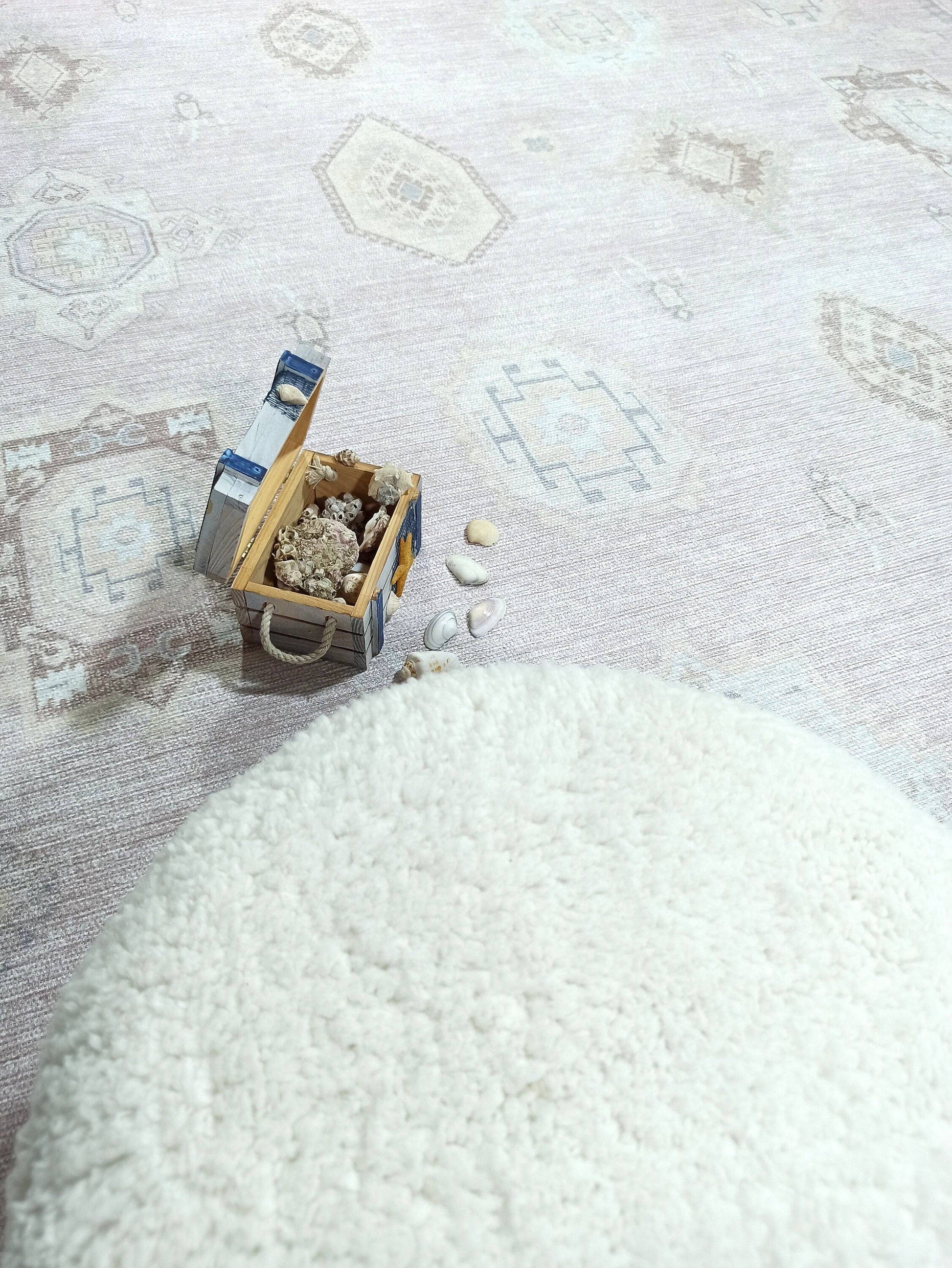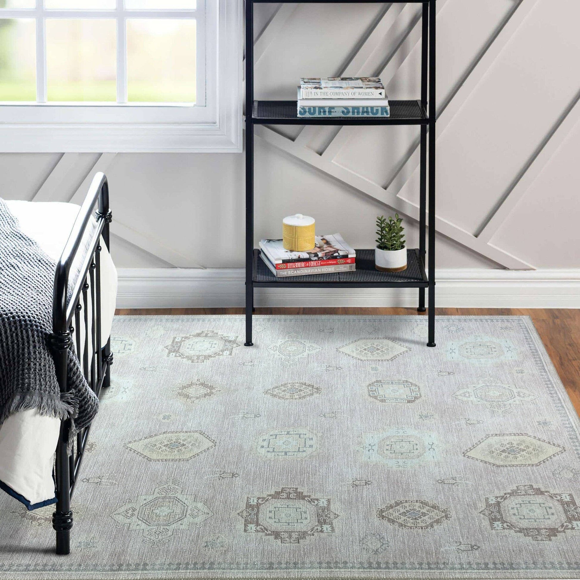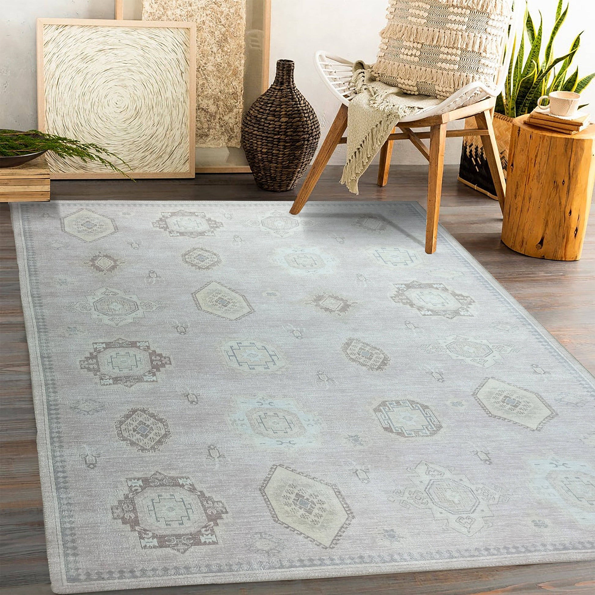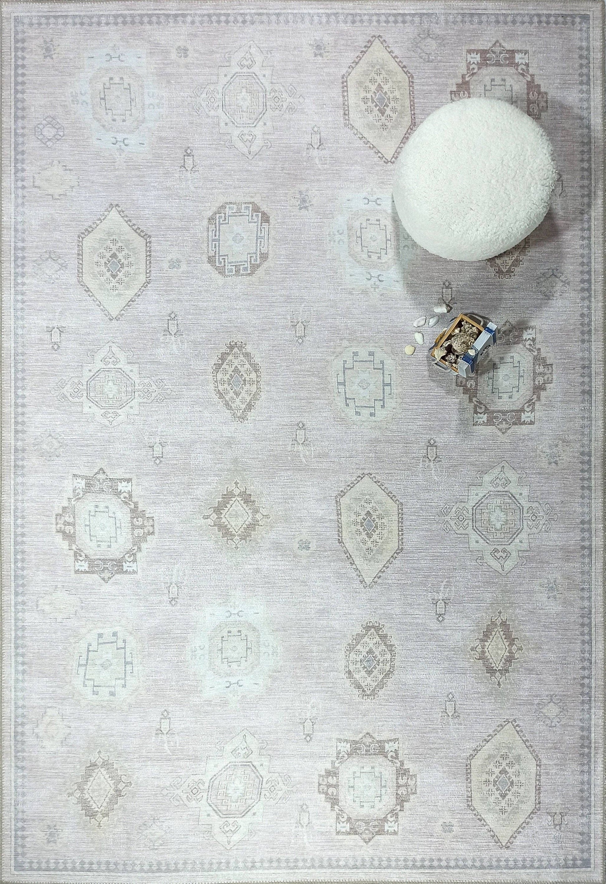 Step into timeless elegance with the Amery Beige Pale Blush Brown Antique Oushak Rug, a beautiful blend of vintage charm and contemporary design. Inspired by well-traveled vintage designs. Combines the charm of timeless designs with easy-care, livability for any home or lifestyle. Features a fresh incarnation of the vintage Turkish rug look. Classic in pattern and modern in color, this rug boasts a beautiful palette of brown, gray, ivory, light beige, muted brown and off white, featuring distinct dye-lot details. Made in Turkiye. This low pile digitally printed assortment of rugs features stunning designs and perfectly distressed effect for effortless charm that are matched with a traction backing ideal for heavily trafficked, hard surface spaces such as entryways, halls, living rooms, bathrooms, and kitchens. Oushak rugs originate from Ushak, Turkiye, and are recognizable by their distinct patterns and color palettes. Oushak rugs are highly sought after and timeless floor coverings. Want to see more Oushak R