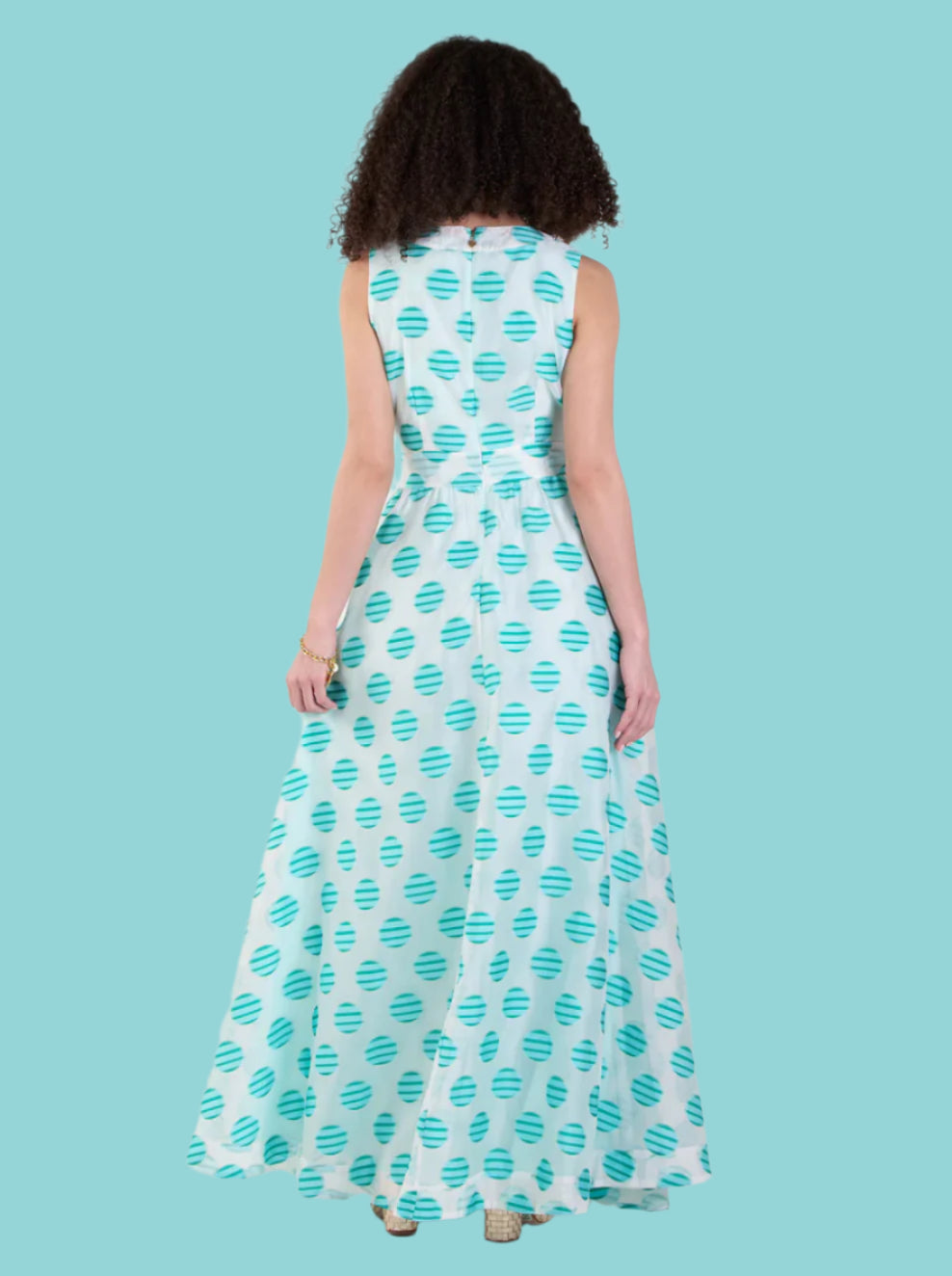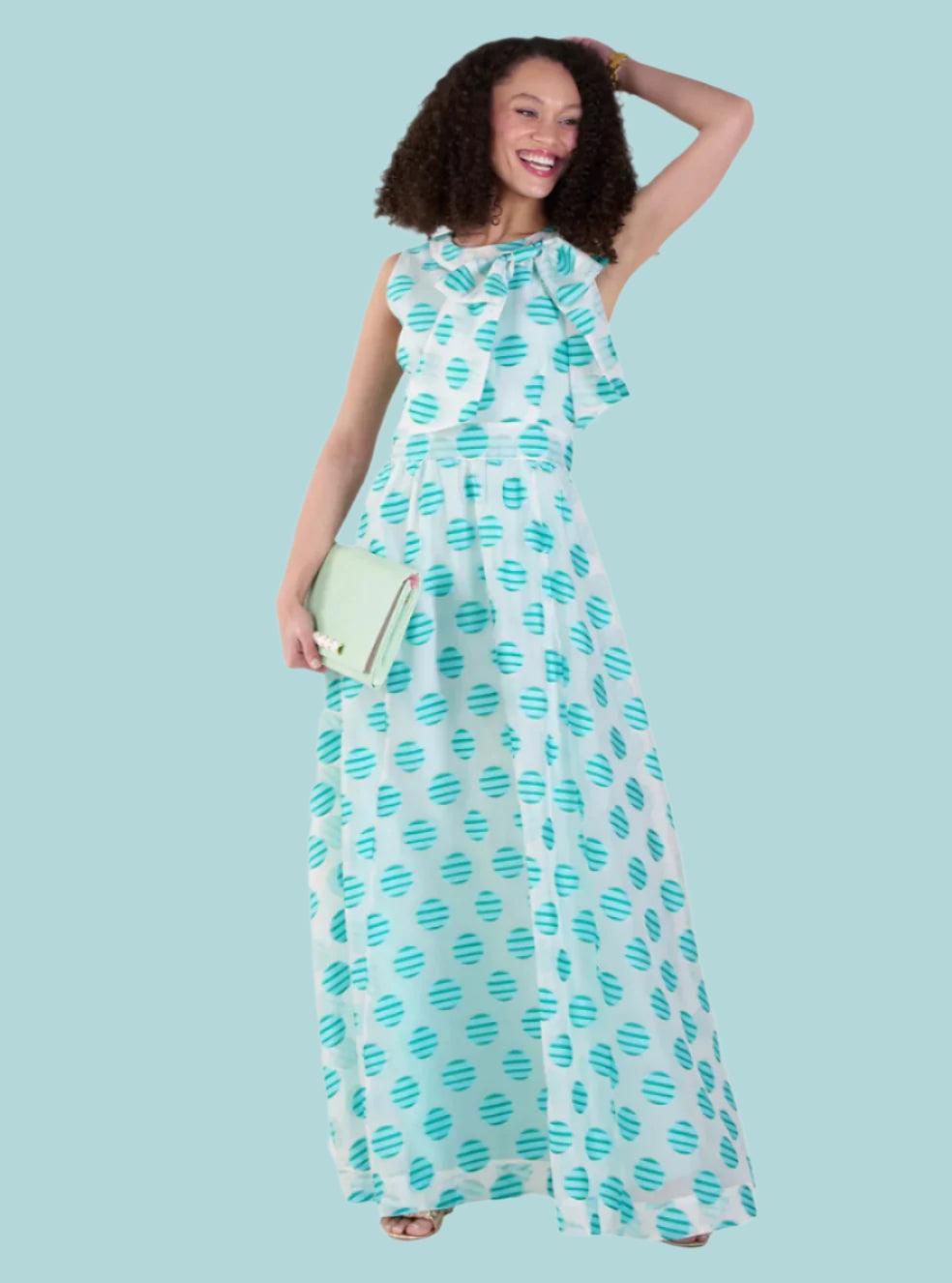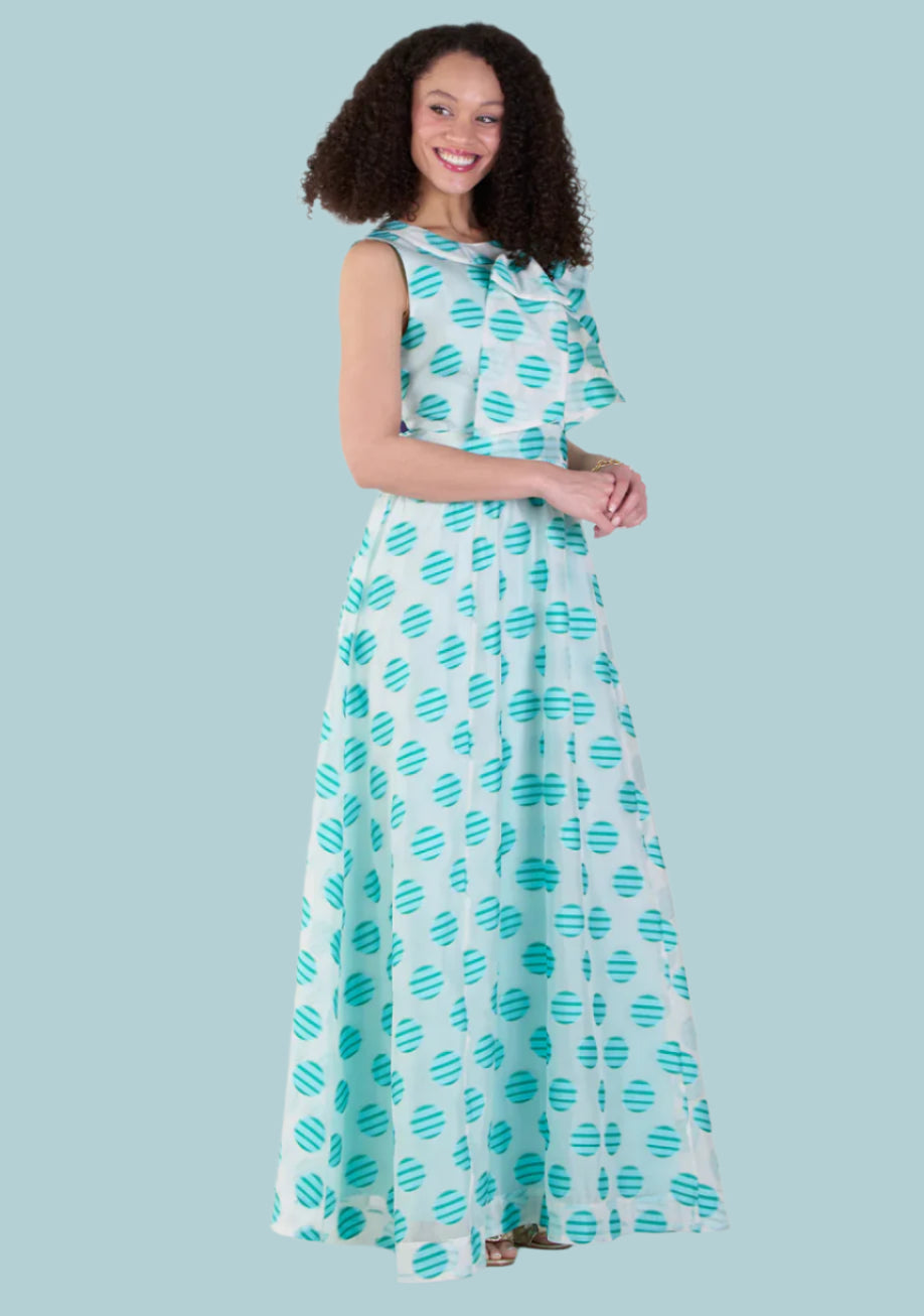The Bella Maxi in Dew Drop is a refined statement piece crafted in airy organza jacquard. This silhouette features a stitched bow detail at the neckline, an empire waist that flatters the form, and a tailored bodice that gently flows into a full-length skirt. The subtle back zip closure ensures a seamless finish. With its tonal textural pattern and feminine charm, this dress is a fresh take on elegant occasionwear.