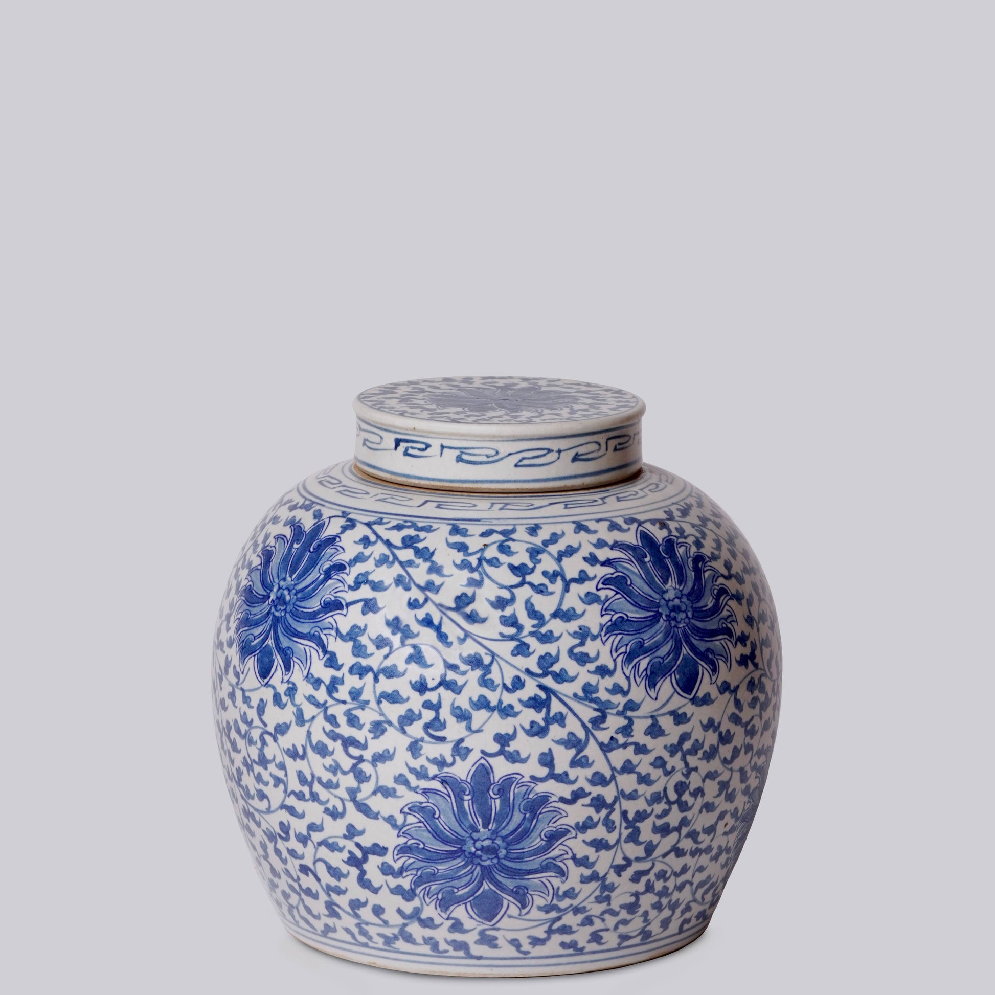 Cobalt Guild offers an assortment of blue and white porcelain vessels from the antiques markets of Jingdezhen, a town long distinguished by imperial patronage. This piece is a round lidded jar with a scrolling lotus pattern in semi matte blue and white, 10 1/2”W x 10”H There are more shapes in this design, and two other colorways!