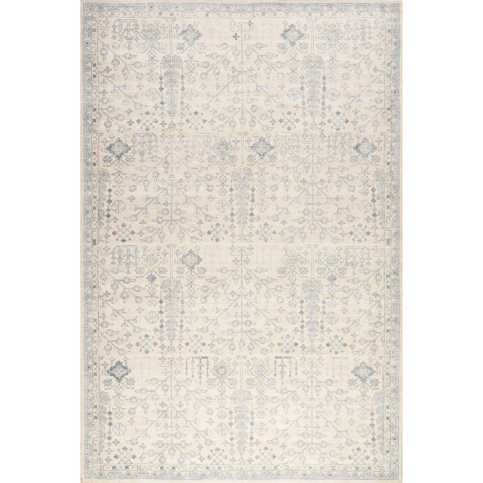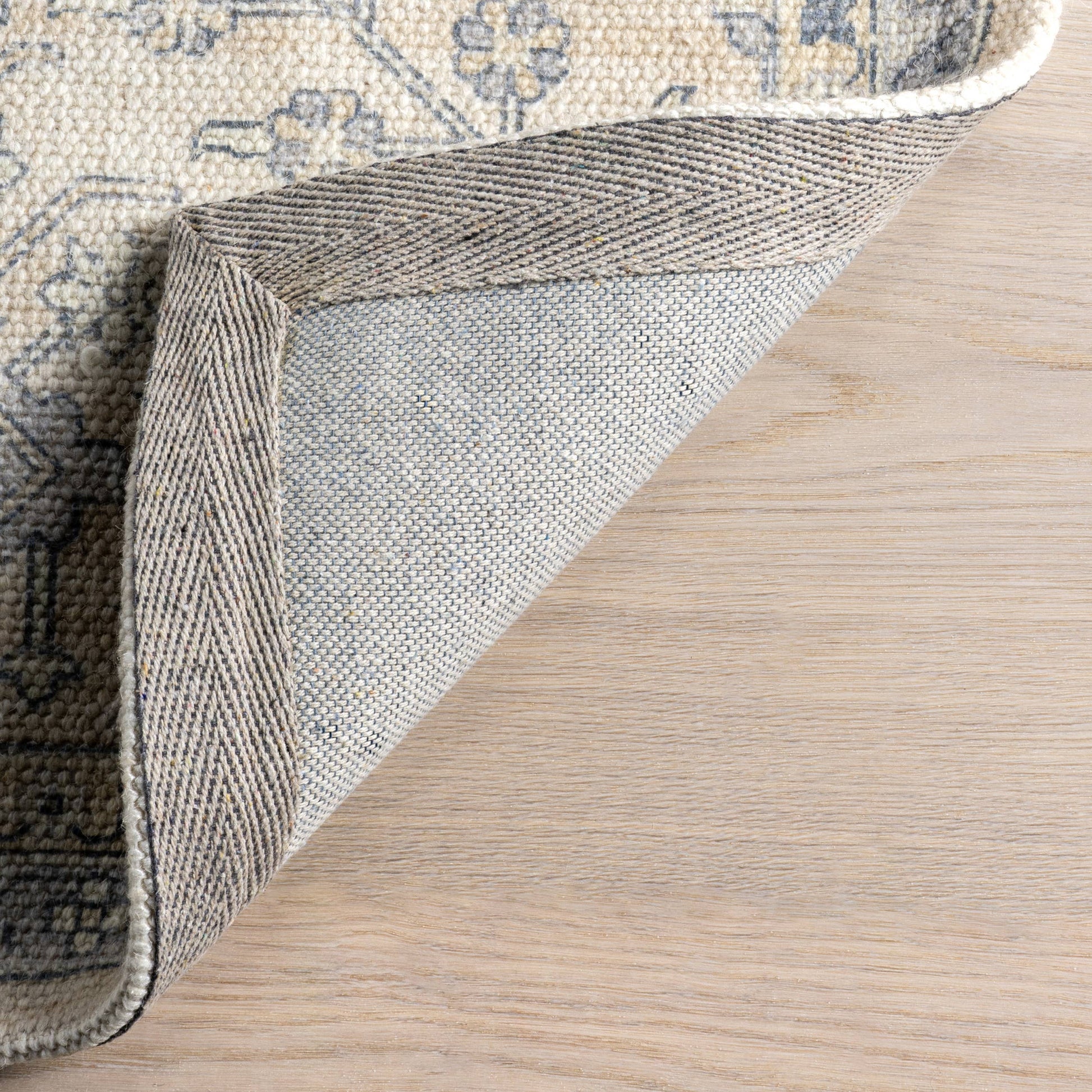 Step straight into a dream and onto the Flora Wool and Cotton Rug. It belies a whimsical, storybook quality designed to cast an ethereal glow throughout your space. Featuring an intricate vintage pattern, muted palette, and a gentle wash of blue, this rug weaves romance and timeless charm together seamlessly. Handcrafted from a cozy wool and cotton blend, it also offers an warm, comfortable underfoot.