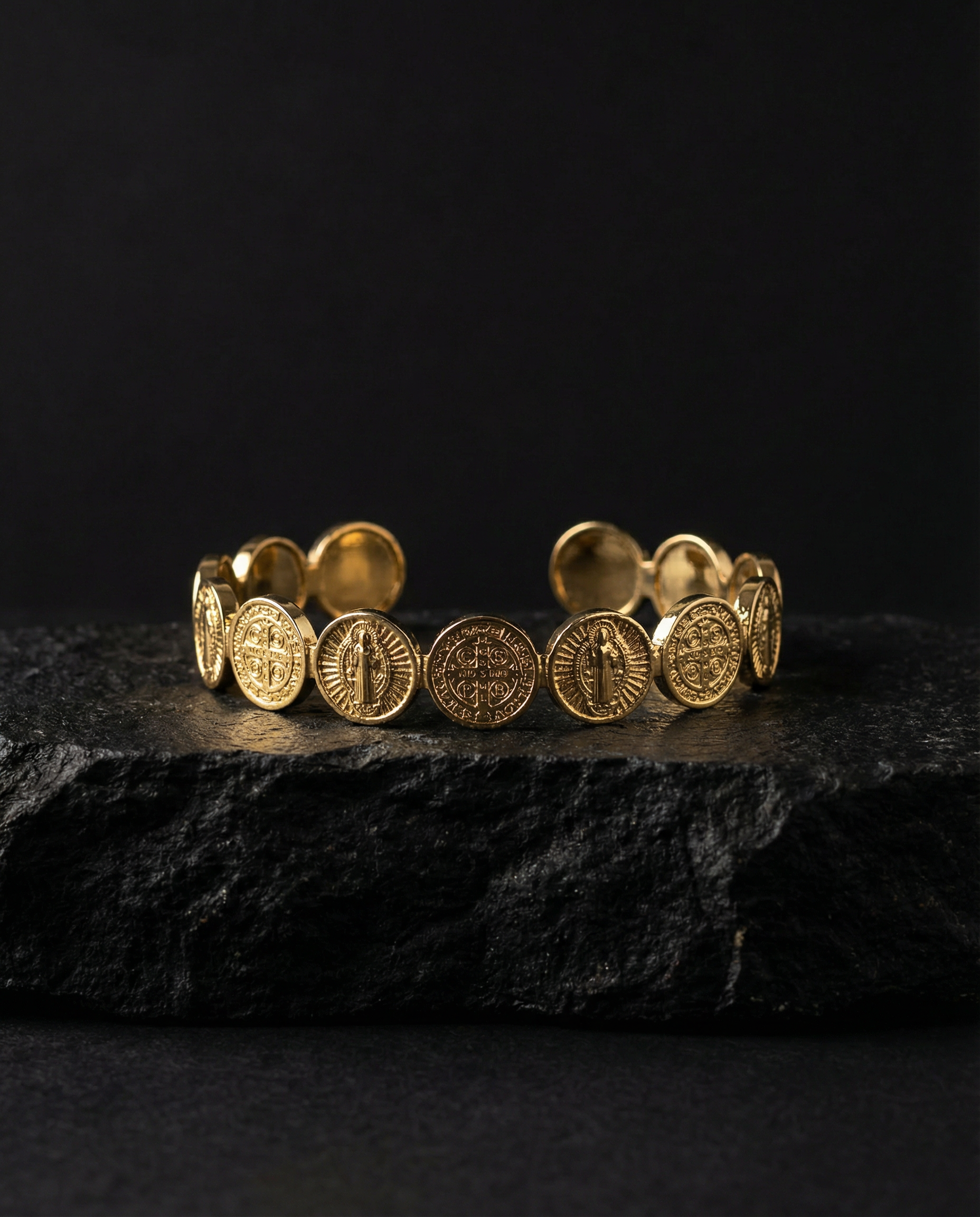 This gold-plated Catholic bracelet of St. Benedict medals is a piece of strong spiritual symbolism and timeless design. Composed of multiple embossed St. Benedict medals, it represents protection, faith, and Christian tradition, reinterpreted in an elegant and contemporary piece of jewelry.