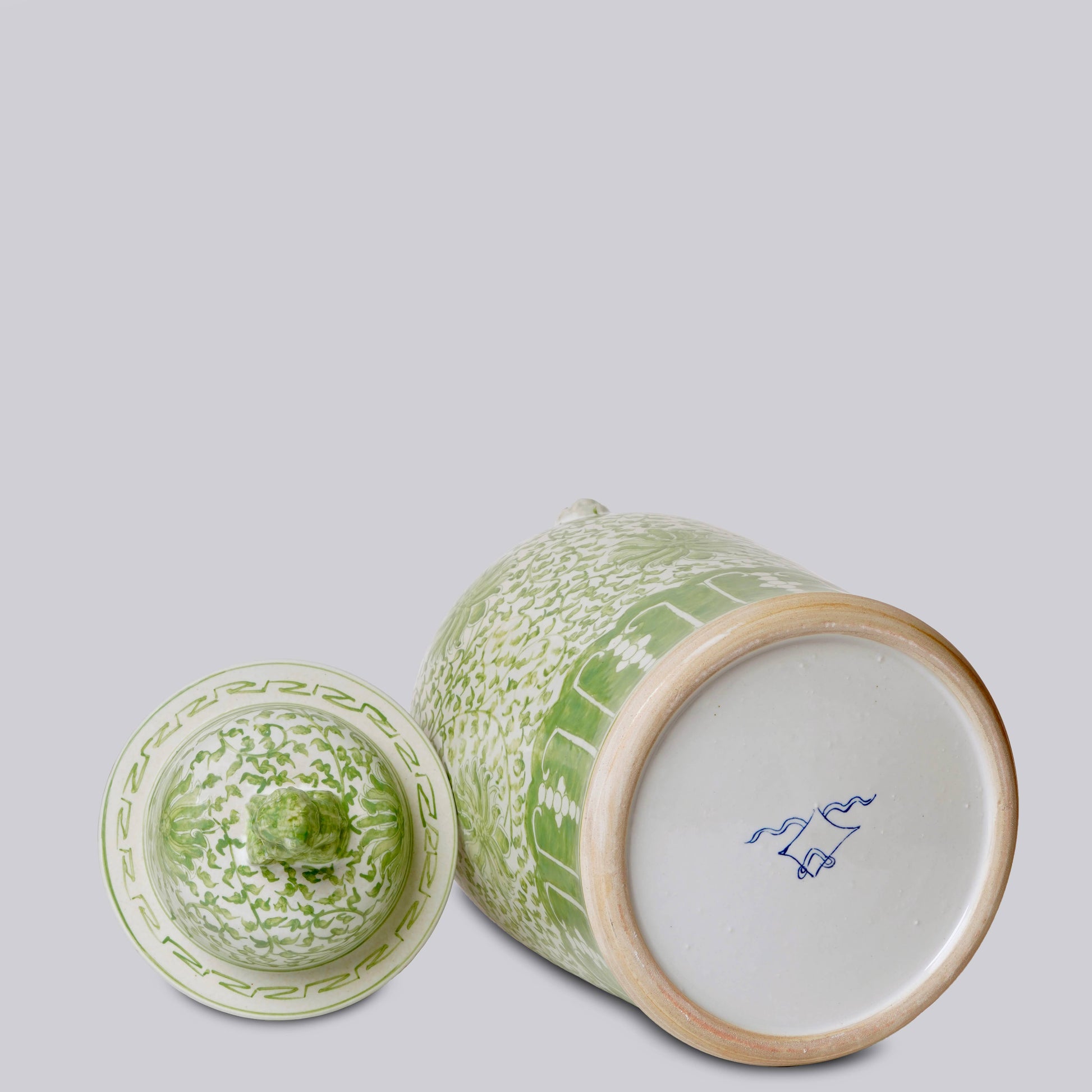 Cobalt Guild offers an assortment of blue and white porcelain vessels from the antiques markets of Jingdezhen, a town long distinguished by imperial patronage. This piece is a porcelain jar with a lively hand painted floral design in fresh green and white, 10 1/2" W x 19 1/2" H