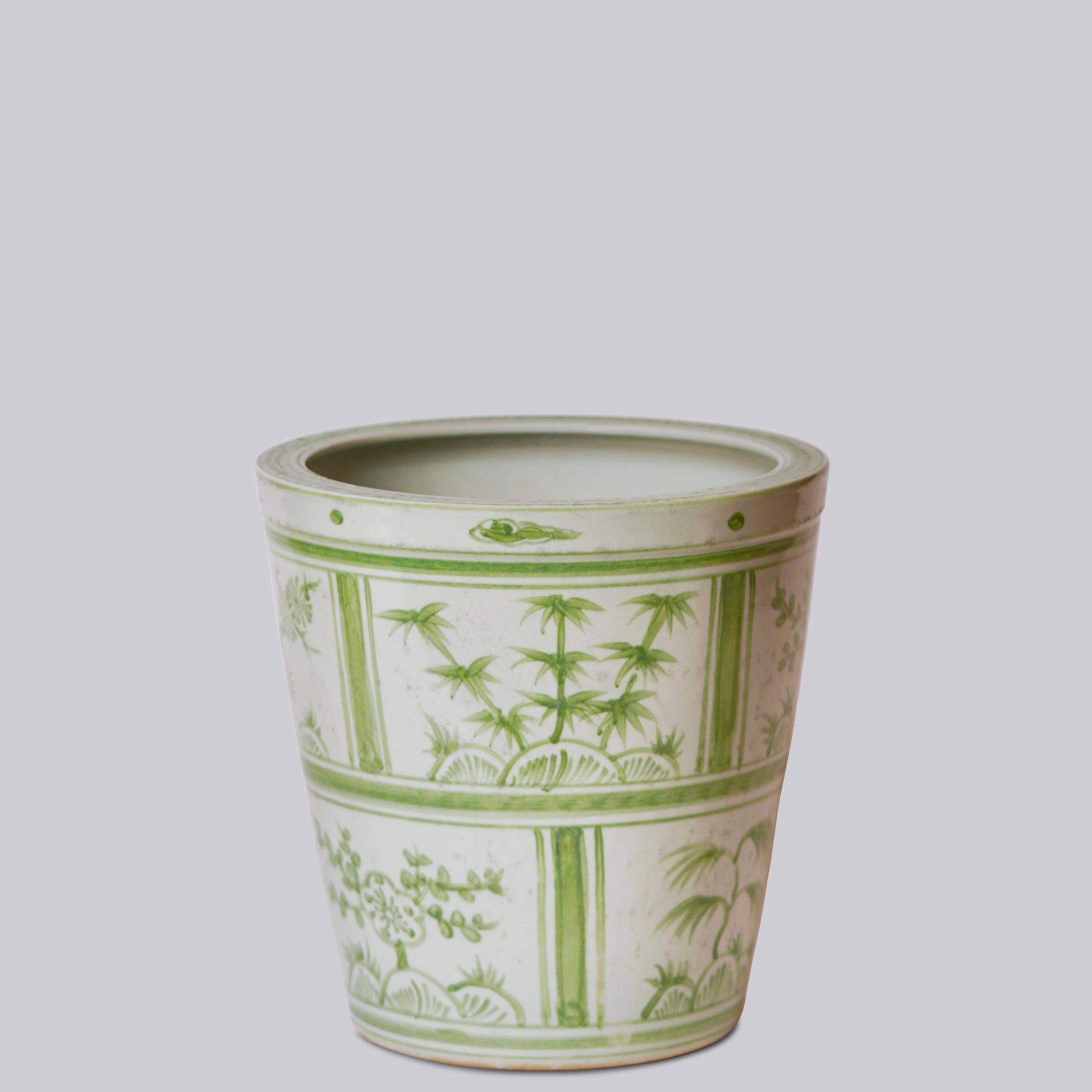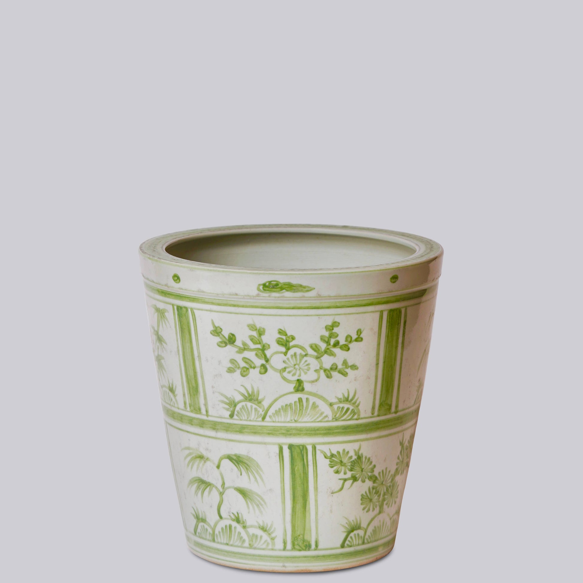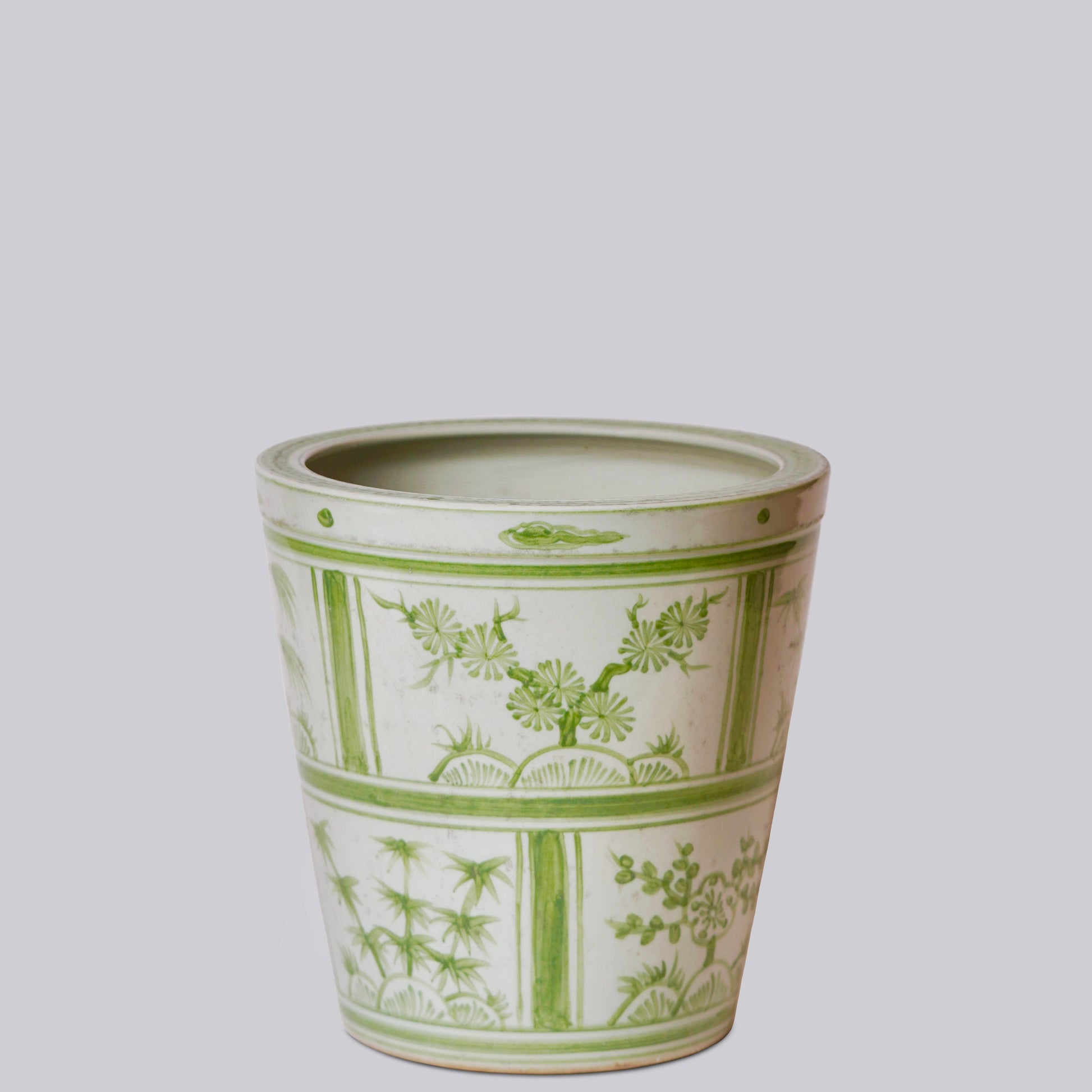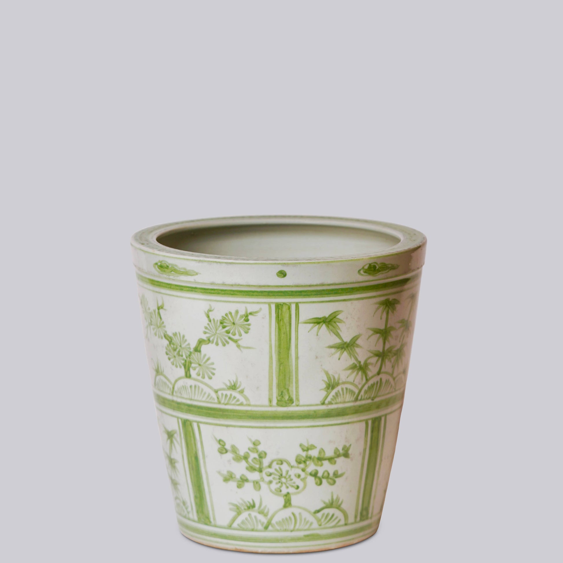 Cobalt Guild offers an assortment of blue and white porcelain vessels from the antiques markets of Jingdezhen, a town long distinguished by imperial patronage. This piece is a hand painted, wheel thrown green and white planter with an intriguing hand painted tiled pattern of the "three friends" plants, 10 5/8" x 10 3/4"