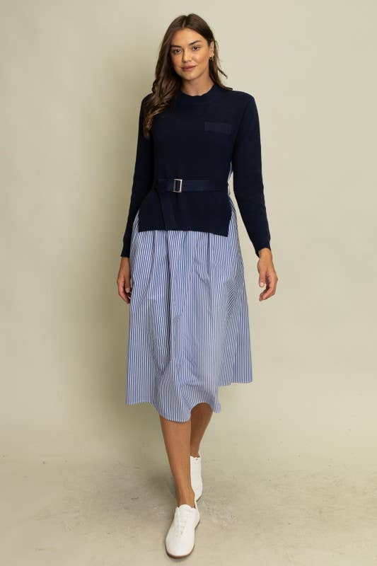 Two-Tone Design: With a contrasting top and skirt, this dress combines a deep navy knit top with a light blue and white striped skirt for a unique, eye-catching look.