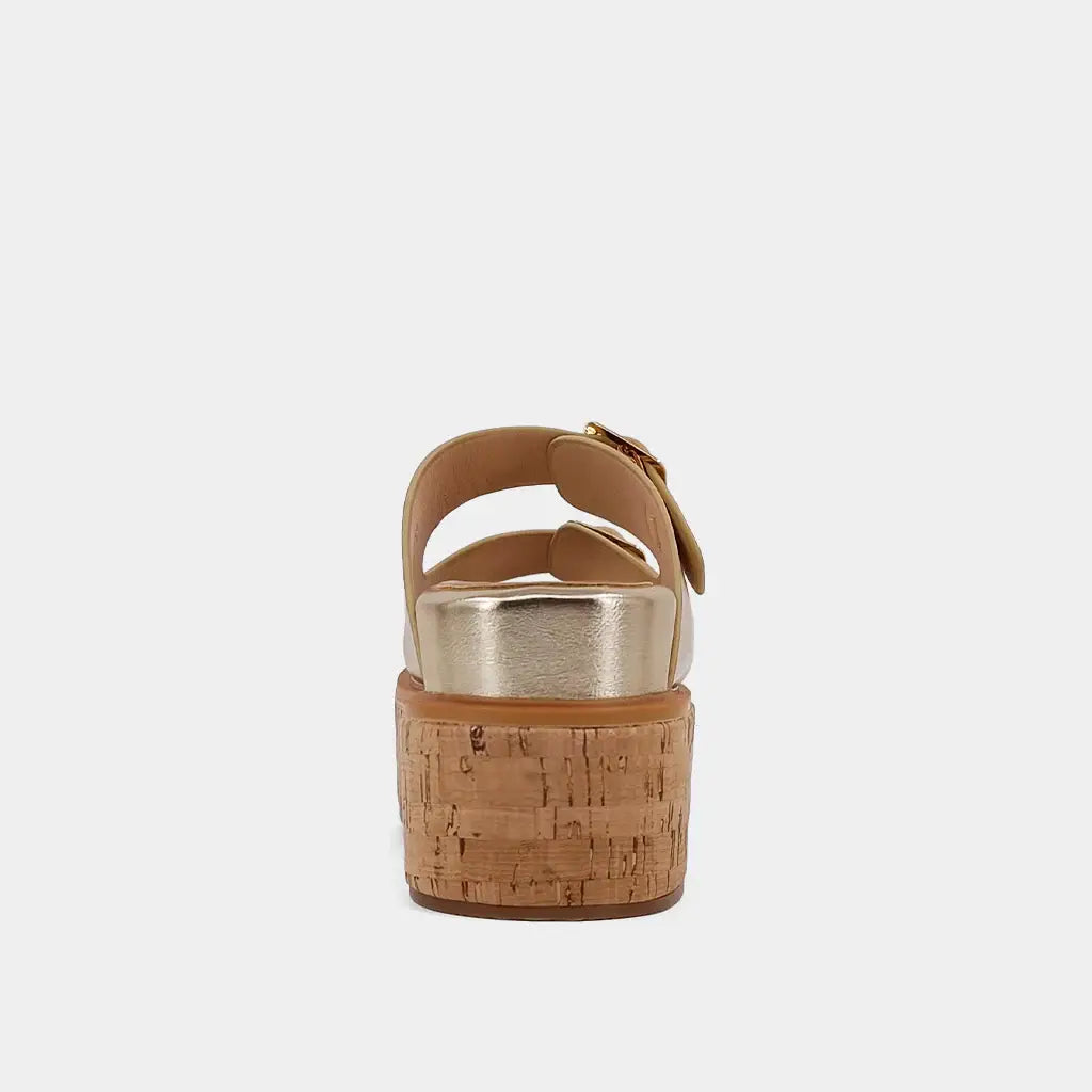 Our new addition, LUCINDA, features buckles that add a gleaming signature to the dual-strap upper of this dreamy metallic faux buttery leather slide sandal. It floats on a cushy memory foam footbed and a timeless cork-wrapped wedge platform. Wear yours with breezy summer dresses or slouchy jeans.