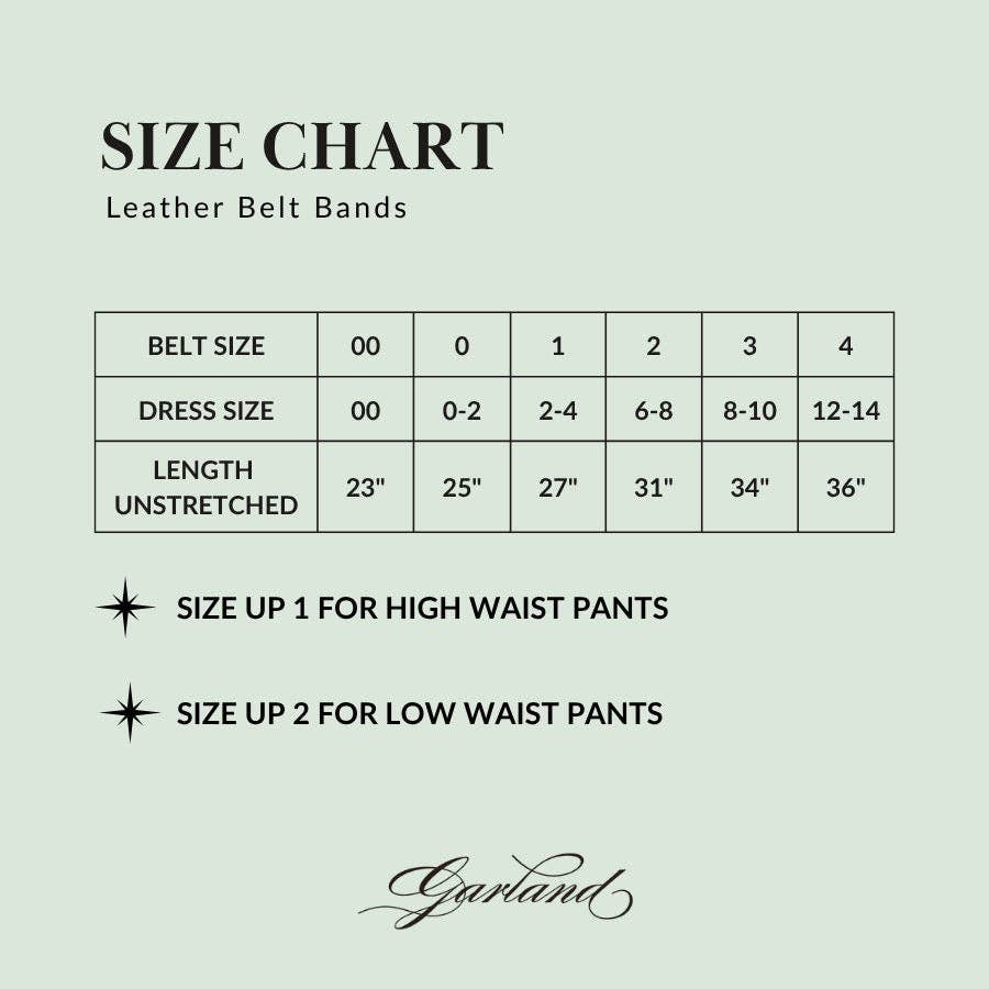 *Please reference the size chart in the photos. The sizing for our leather belts is slightly different than sizing for our other stretch belts (since they don't stretch quite as far). We have included additional sizes in our offerings to accommodate this!