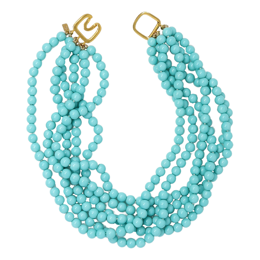 USA-made, this vibrant necklace consists of six rows of beautifully, hand-strung strands of 8 millimeter turquoise colored beads. Closes with a gold hook clasp. Dimensions: 18"