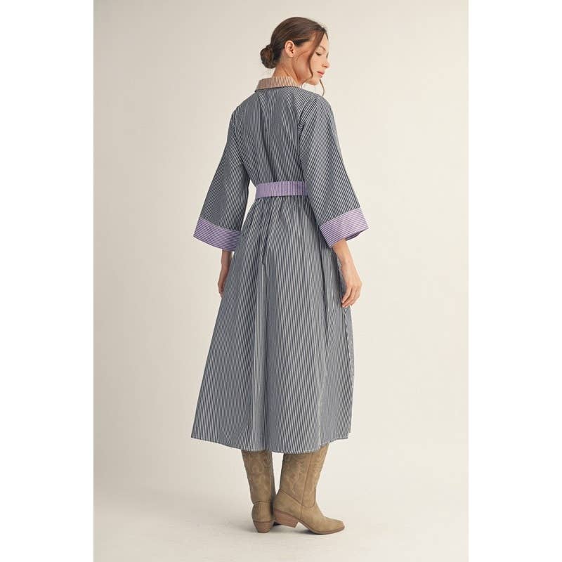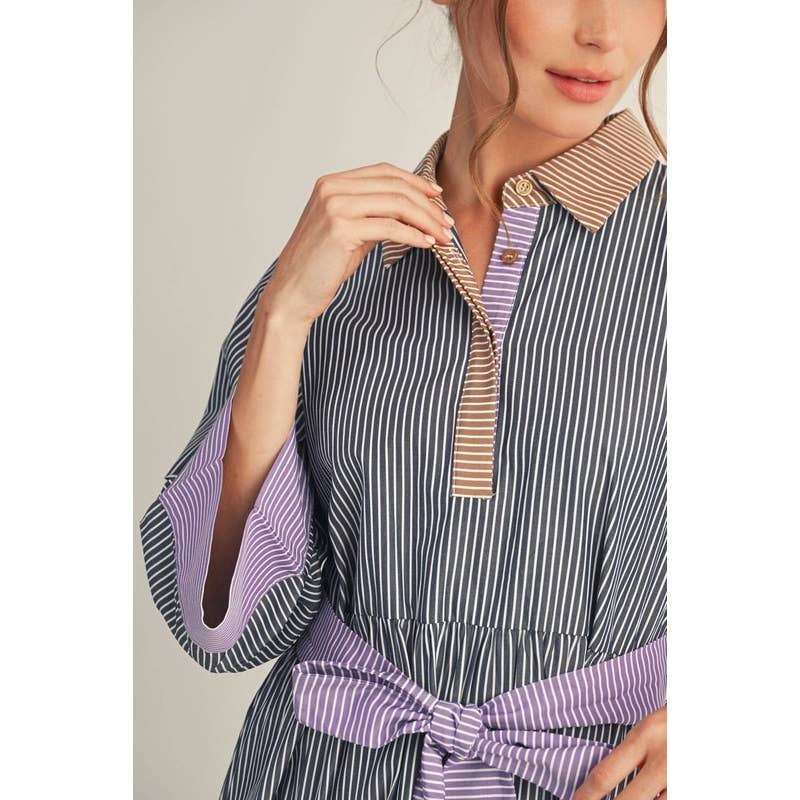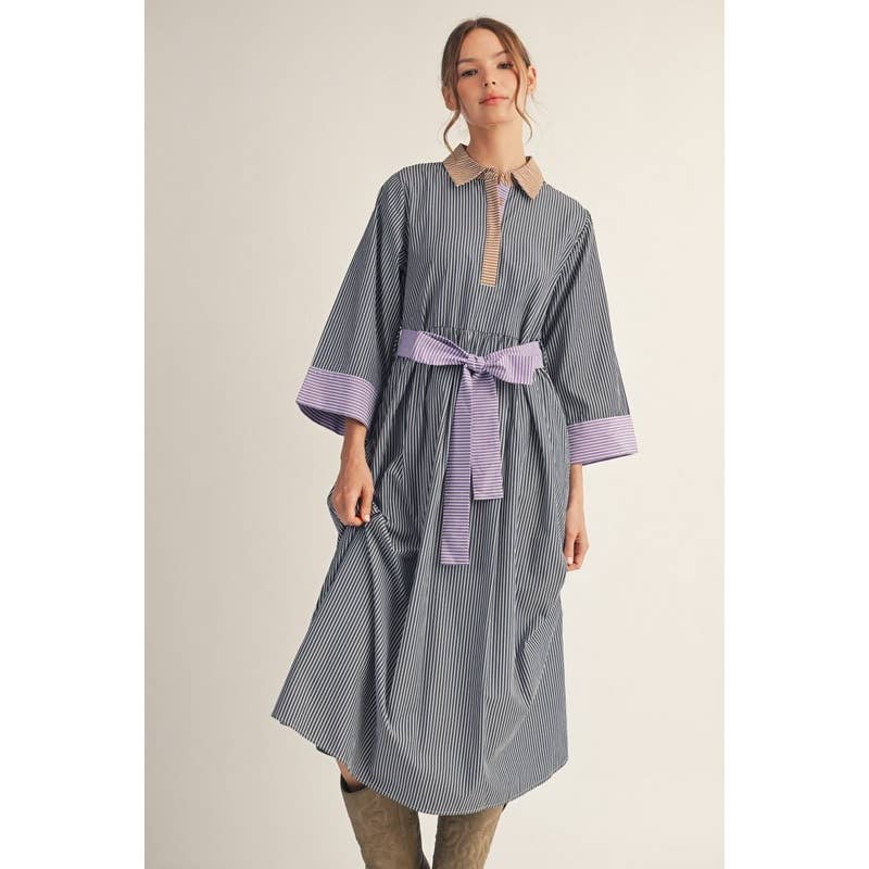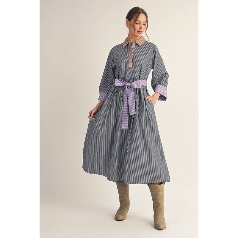 - - 3/4 sleeves stripe fabric mix midi dress with side pockets, front button up, multi color stripe fabric mix match, collared neckline, waist tie detail.