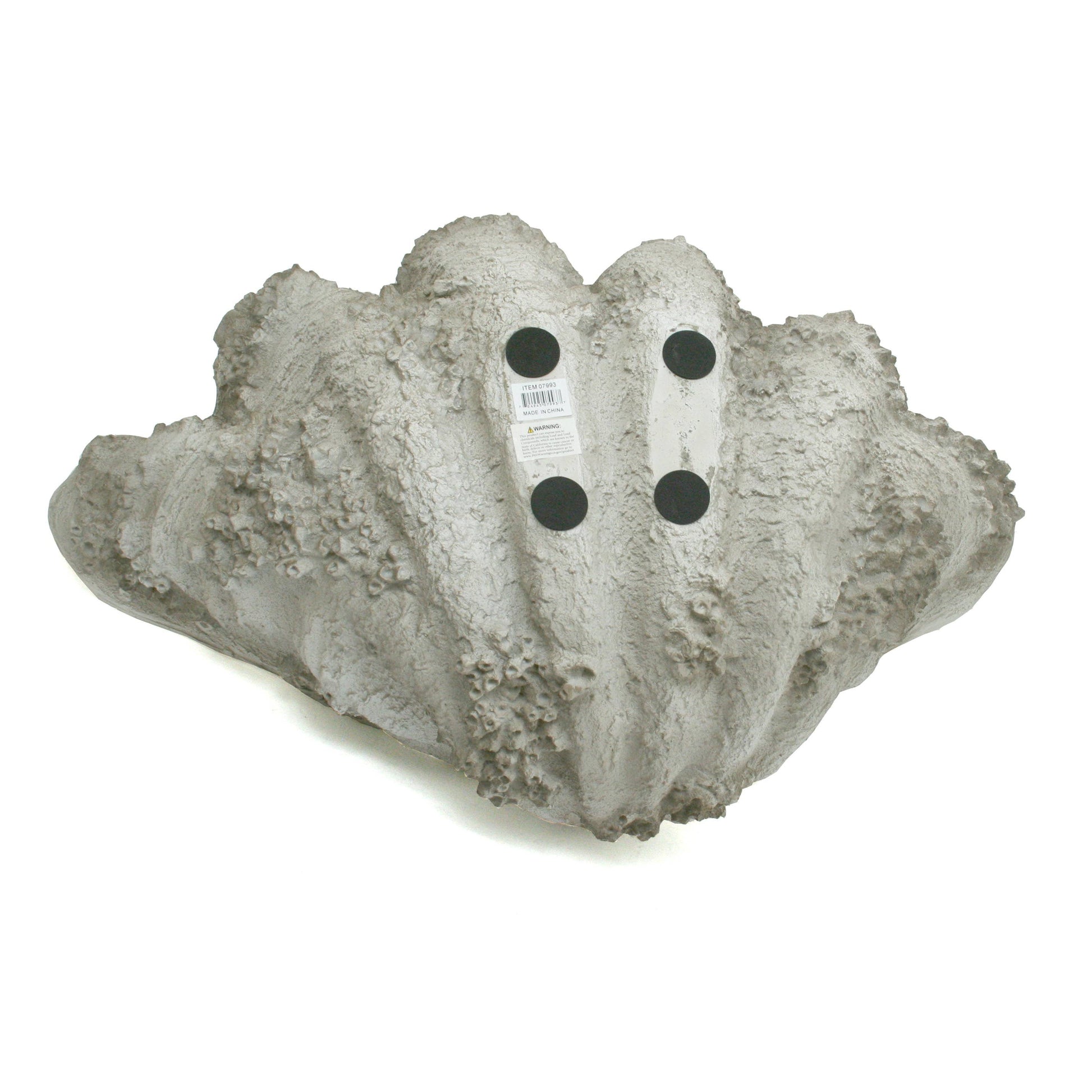 This XL Gigas Clam Shell with Barnacles is made from polyresin. The measurements are 33x22x16" H.